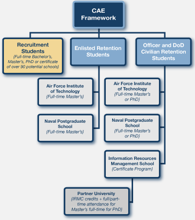 Recruitment program students may apply for a scholarship through a non-DoD institution which has been designated as a CAE or CAE-R (research CAE) and elects to participate in the scholarship program. Retention program students may attend institutions as shown.Individuals who elect to complete the scholarship program through the National Defense University’s Information Resources Management College and a partner university may attend only those schools and degree programs which are noted as IASP qualified. The diagram below shows the CAE framework with recruitment and retention program options.